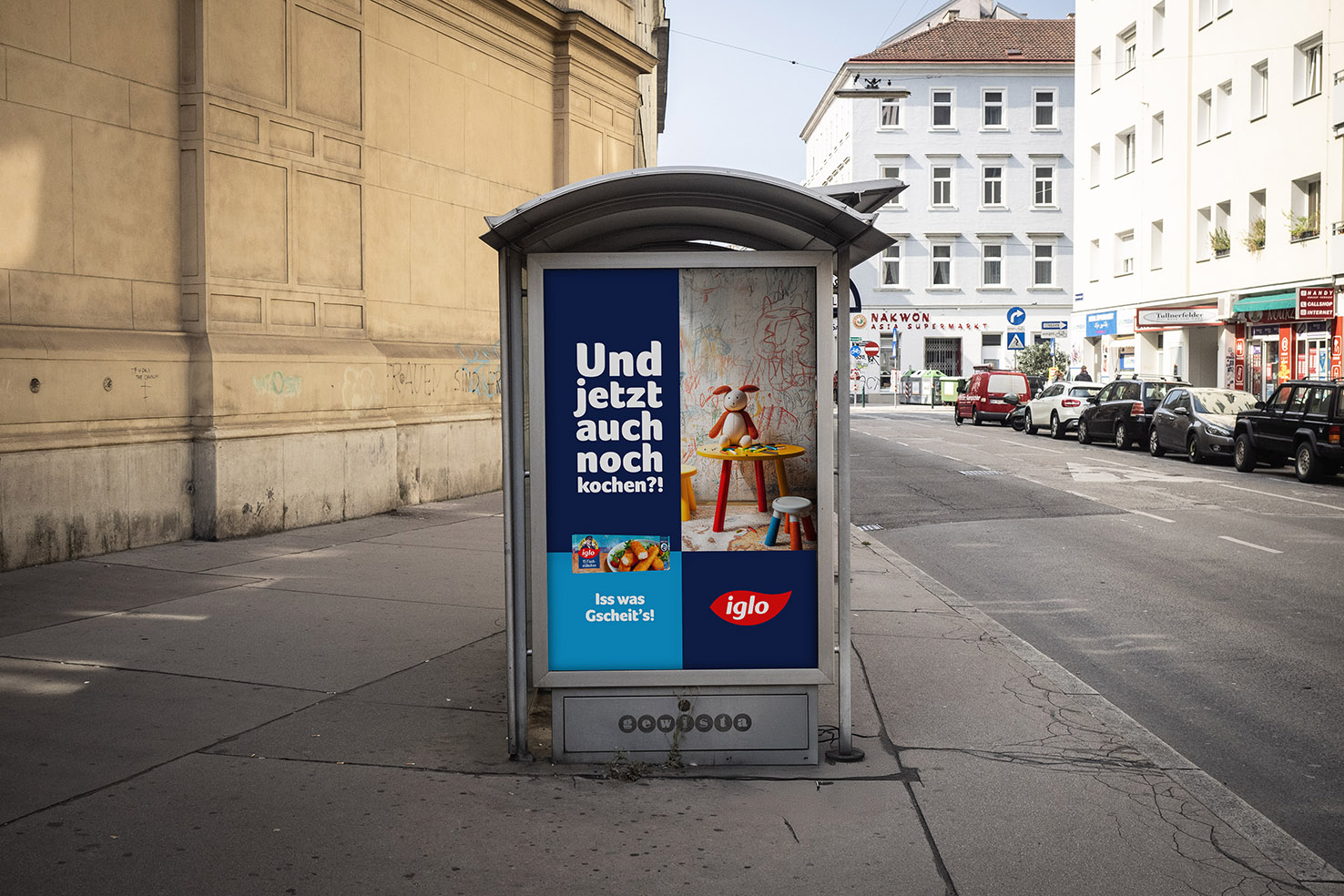 Auf den Plakatsujets finden sich Beispiele, die jeder aus seinem Alltag kennt: „Und jetzt auch noch kochen?!“ zeigt ein unaufgeräumtes Kinderzimmer, während „Öffnungszeiten sind nicht so Deins?“ mit einem leeren Einkaufswagen in einem nächtlich verlassenen Supermarkt aufwartet. Diese Alltagssituationen werden mit den Lösungen von iglo kontextualisiert, um den Frust der Zielgruppe aufzufangen und in positive Assoziationen umzuwandeln.