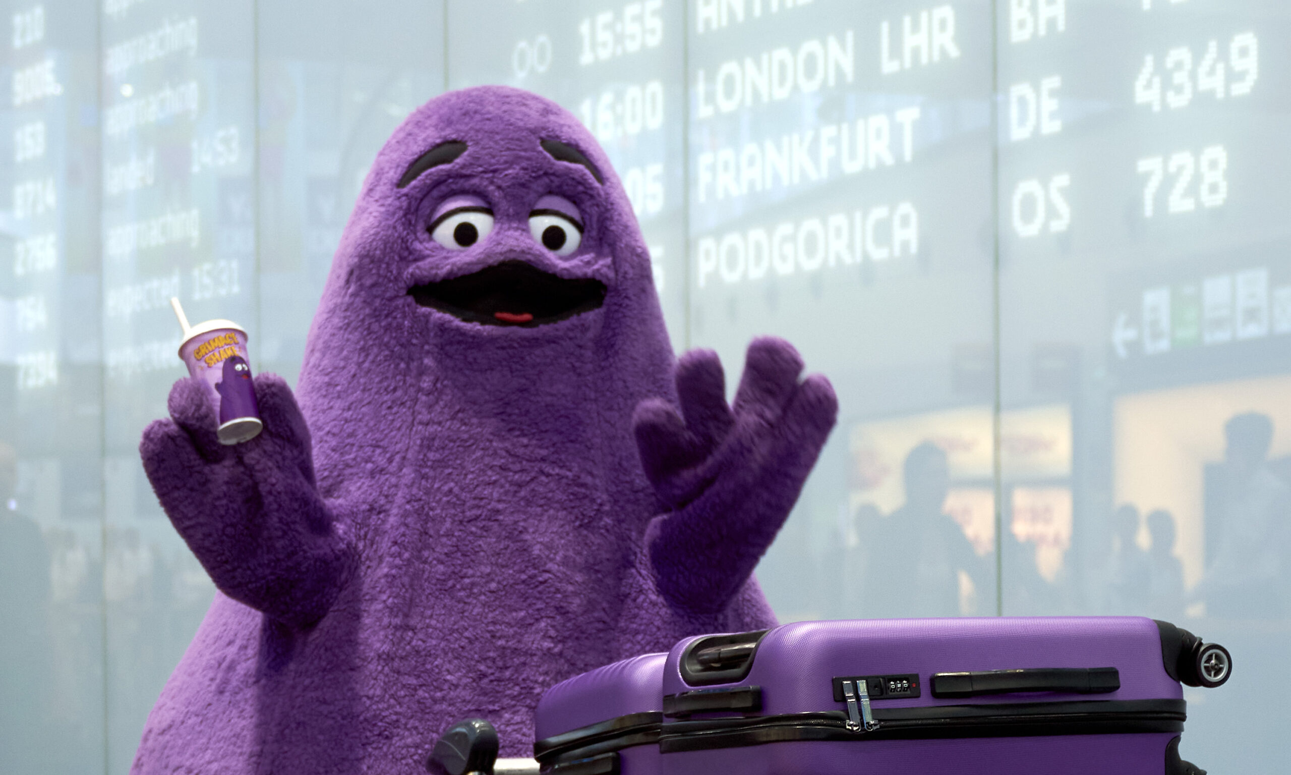 Das lila McDonald’s Maskottchen unternimmt eine Tour mit Fotomöglichkeiten, interaktiven Aktionen und Events.