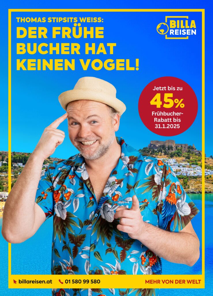 Der heimische Reiseveranstalter BILLA Reisen arbeitet in seiner neuen Frühbucherkampagne mit dem beliebten Kabarettisten, Schauspieler und Autor Thomas Stipsits zusammen.